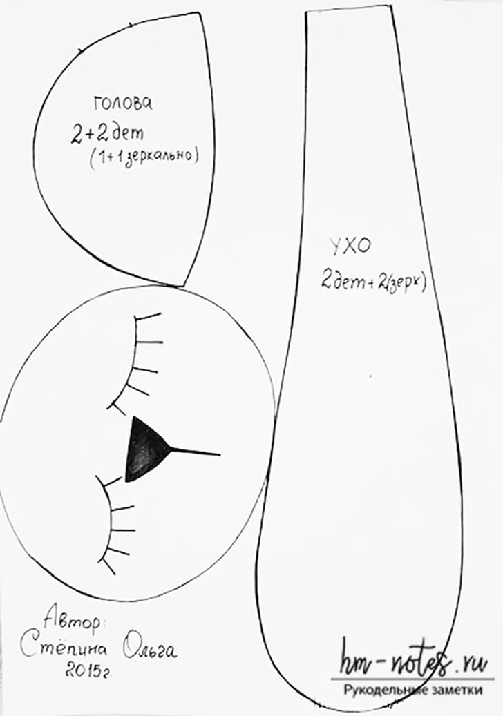 Скачайте выкройку зайца на нашем сайте «Рукодельные заметки» и распечатайте на принтере на листе бумаги формата А4 и вырежьте все детали по контуру.