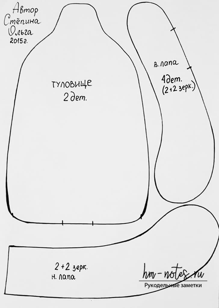 Затем сшейте туловище, лапки и выверните детали на лицо. Отверстия для набивки в лапках также лучше оставлять в местах соединения их с туловищем. А в туловище — в месте соединения с головой. Туловище и голова игрушки могут быть цельнокроенными, по такой выкройке шить легче всего, ведь голову пришивать не нужно.