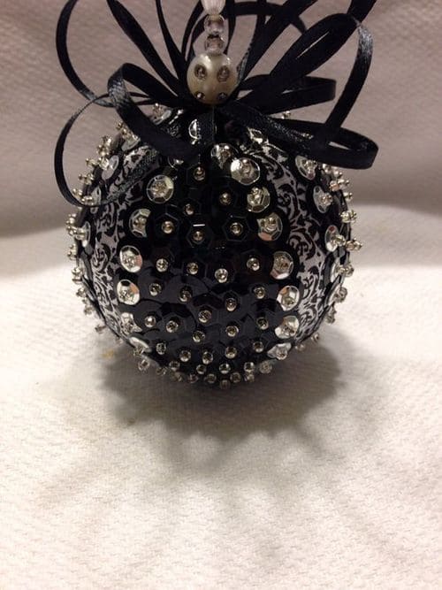 Эти шары украшены пайетками, бисером и лентами. Крепятся они также небольшими булавками к пенопластовой заготовке.
