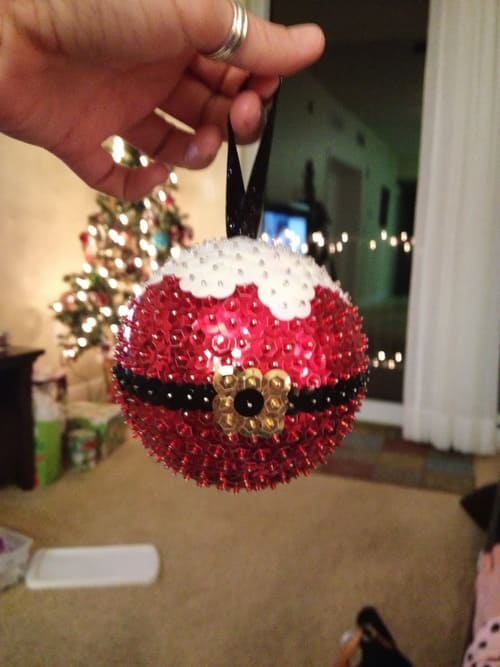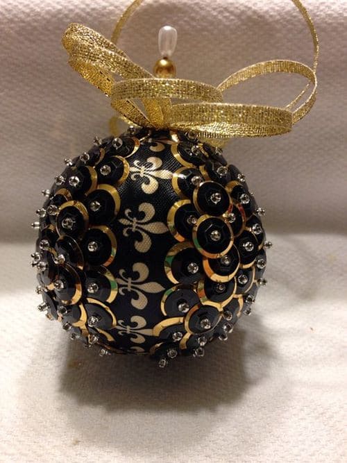 Из золотых ленточек сделайте бантик и приклейте его горячим клеем. Внутрь можно добавить блесток или бусины разных размеров и цветов. Вообще, пластиковые шары удобны для поделок, их можно украсить, как угодно.