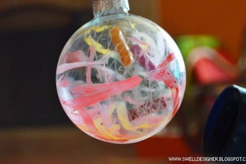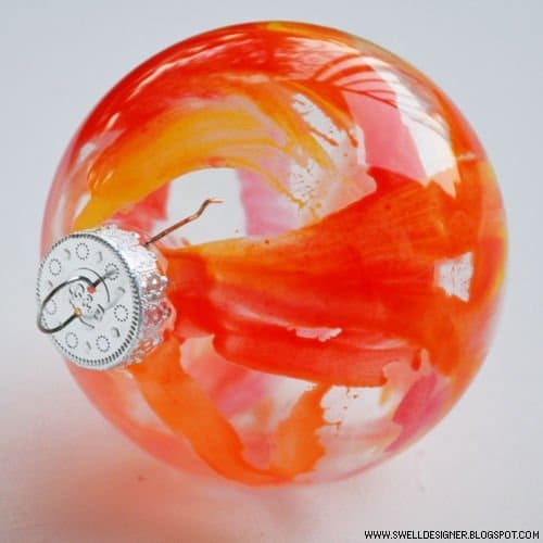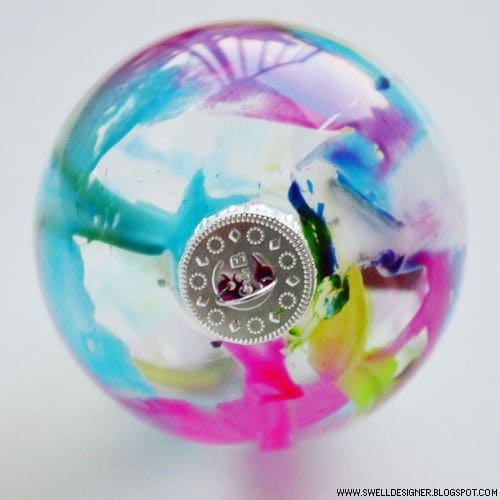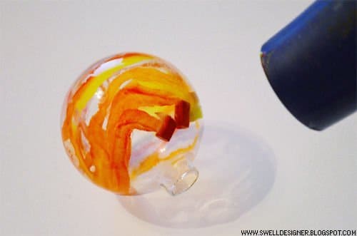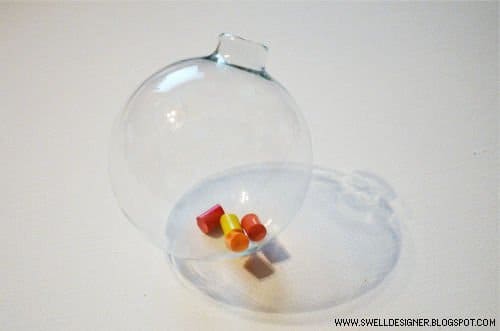 Со стеклянными ёлочными шарами из прозрачного стекла также можно экспериментировать. Например, взять кусочки цветных восковых карандашей и поместить их внутрь шаров. Феном нагреть стекло и растопить воск. Таким образом, можно создать любой цвет и узор на стенках шара.