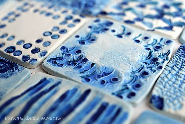 Теперь линейкой и карандашом разметьте пласт на квадраты и вырежьте их при помощи канцелярского ножа или формочки для печенья. Влажной губкой закруглите края плитки. Слегка вдавливая в поверхность различные предметы или готовые штампы, создайте рельеф. Старайтесь делать все быстро, чтобы масса не подсохла во время работы.