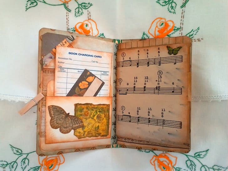Если же вы реально смотрите на внешний мир, но при этом остаётесь романтиком, увлекаетесь музыкой или акварельными зарисовками, то сделайте свой личный дневник, в котором будете записывать все свои планы и сохранять творческие задумки. Используйте для оформления набор листов бумаги для скрапбукинга «Веселые ноты», «Бабочки», цветы «Белая тропическая роза» или «Дюймовочка», вырубки листьев и цветов.