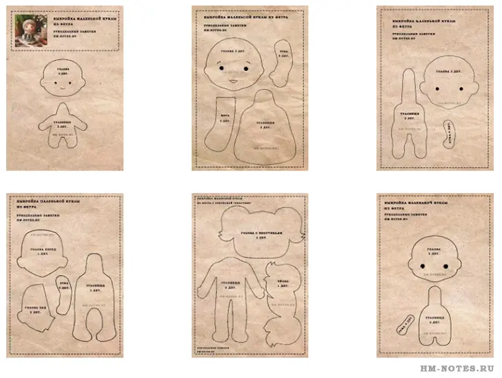 Впрочем, цельнокроенное тело с ножками или ручками тоже кроить несложно. Для примера можете скачать на нашем сайте «Рукодельные заметки» несколько таких универсальных выкроек. Тут есть выкройка, где ручки и ножки выкраиваются отдельно, а также выкройка куклы с более объёмной головой.