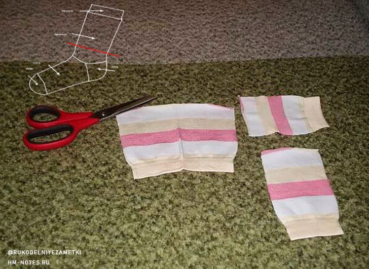 Отрежьте верхнюю часть носков с манжетой, которая называется паголёнок. Разрежьте один паголёнок на две части — это будут рукава, а другой — только пополам — это будет цельнокроенная спинка и перед кофты.