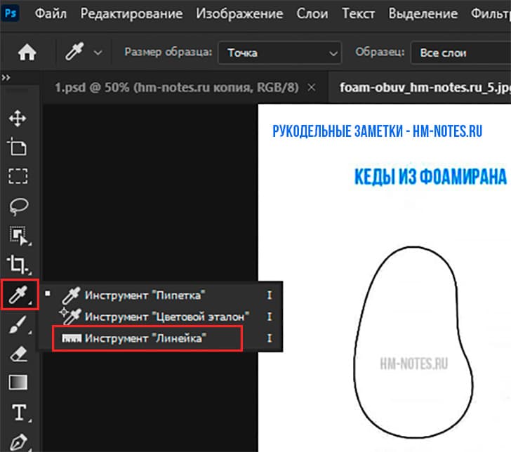 - Для ещё более точного измерения кликните по «Пипетке» на панели инструментов и в выпадающем списке выберите инструмент «Линейка».