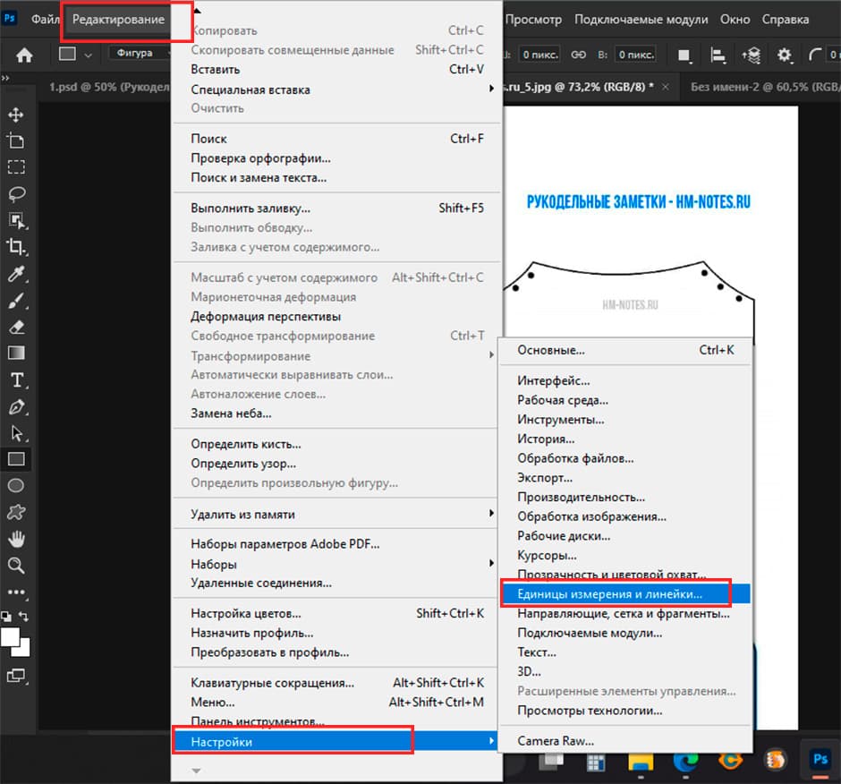 - Выберите в меню пункт «Редактирование (Edit)» — «Настройки (Preferences)» — «Единицы измерения и линейки (Units & Rulers)». В открывшемся окне переключите параметр «Линейки» с пикселей на сантиметры. Сохраните изменение. Для смены единиц измерения можно также кликнуть по линейке правой кнопкой мыши.