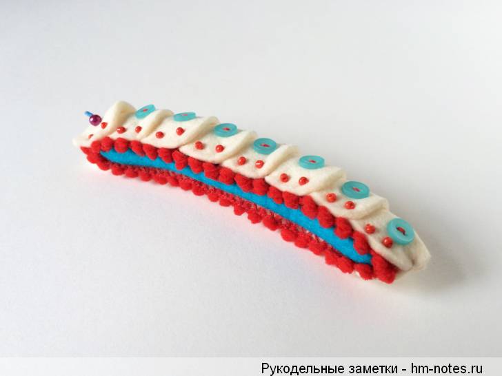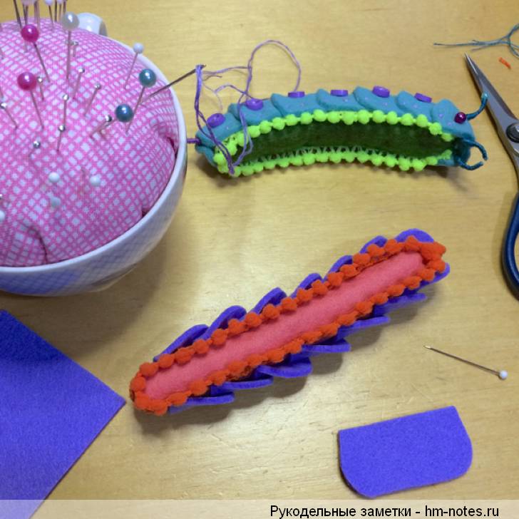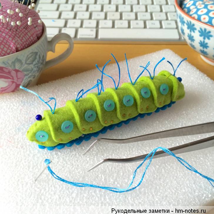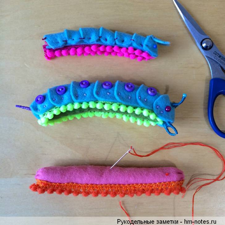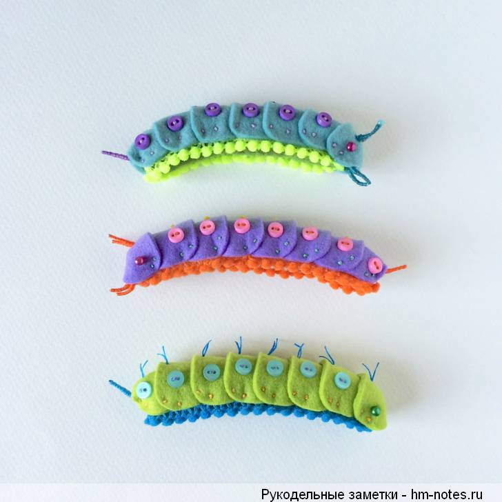 По соседству расположились гусеницы, сделанные из фетра, пуговиц и маленьких бусинок.