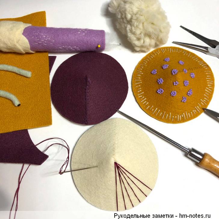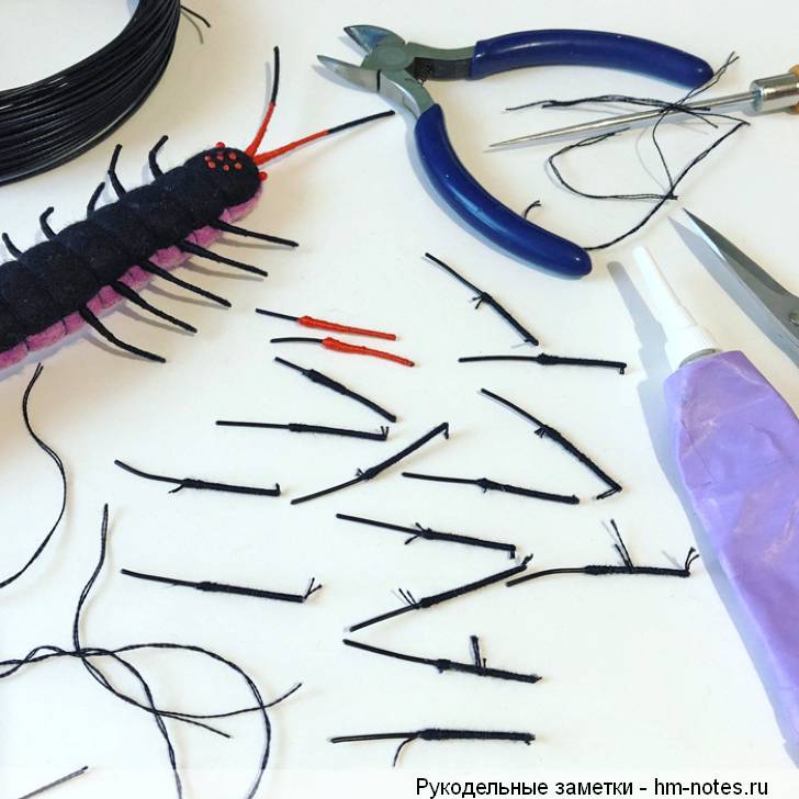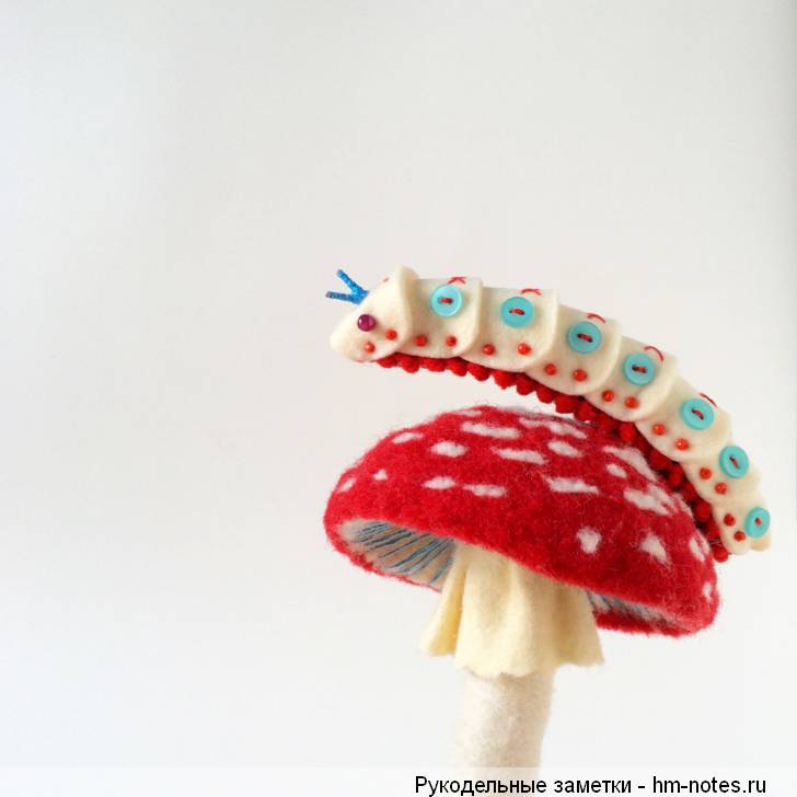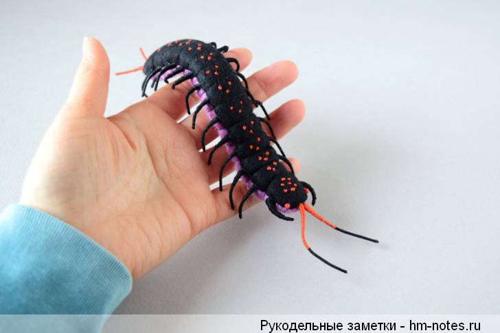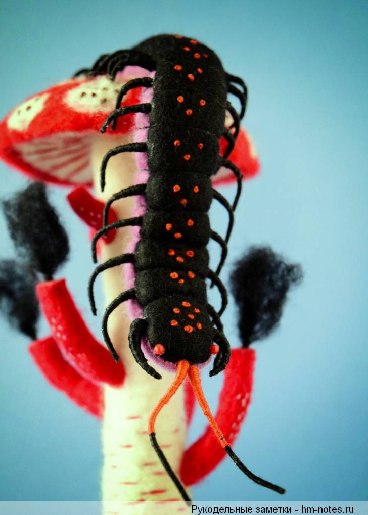 Также в фетровом мире Хинэ водится чёрная многоножка в красную крапинку. Она зацепилась за войлочный мухомор и ждёт, когда кто-нибудь возьмёт её на ручки. Но осторожно, часто встречаются ядовитые многоножки, например, сколопендра. Но есть и безобидные, такие как кивсяк. Их заводят в качестве домашних питомцев.