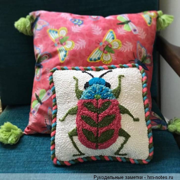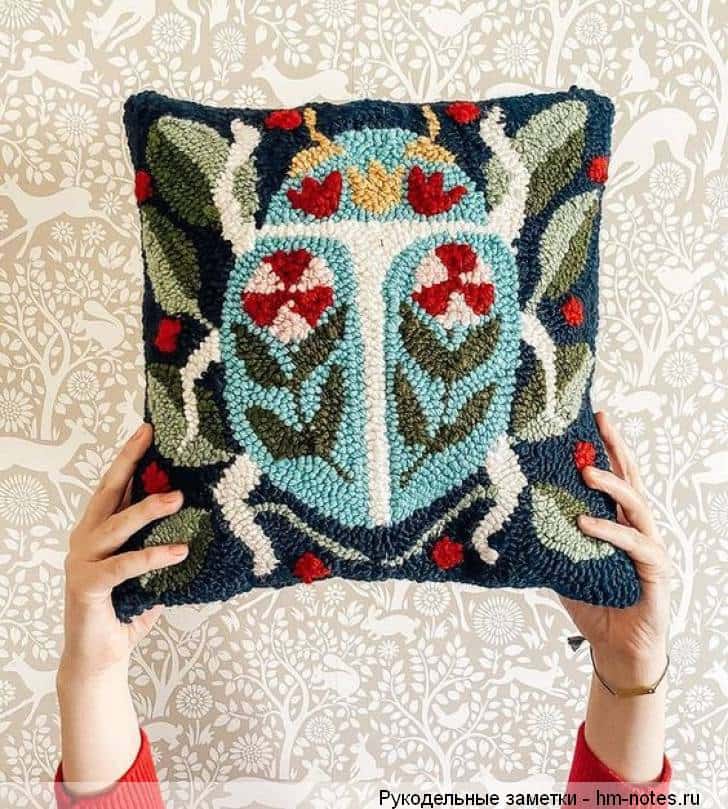 Не умеете ни шить, ни вязать, тогда есть вид хобби, которое легко освоить, называется — ковровая вышивка. Для этого берут специальную толстую иглу, пряжу, пяльца и начинают очень быстро тыкать этой иглой в кусок ткани. Таким образом, можно быстро создавать потрясающие вещи, например, наволочки для подушек с изображением жуков.