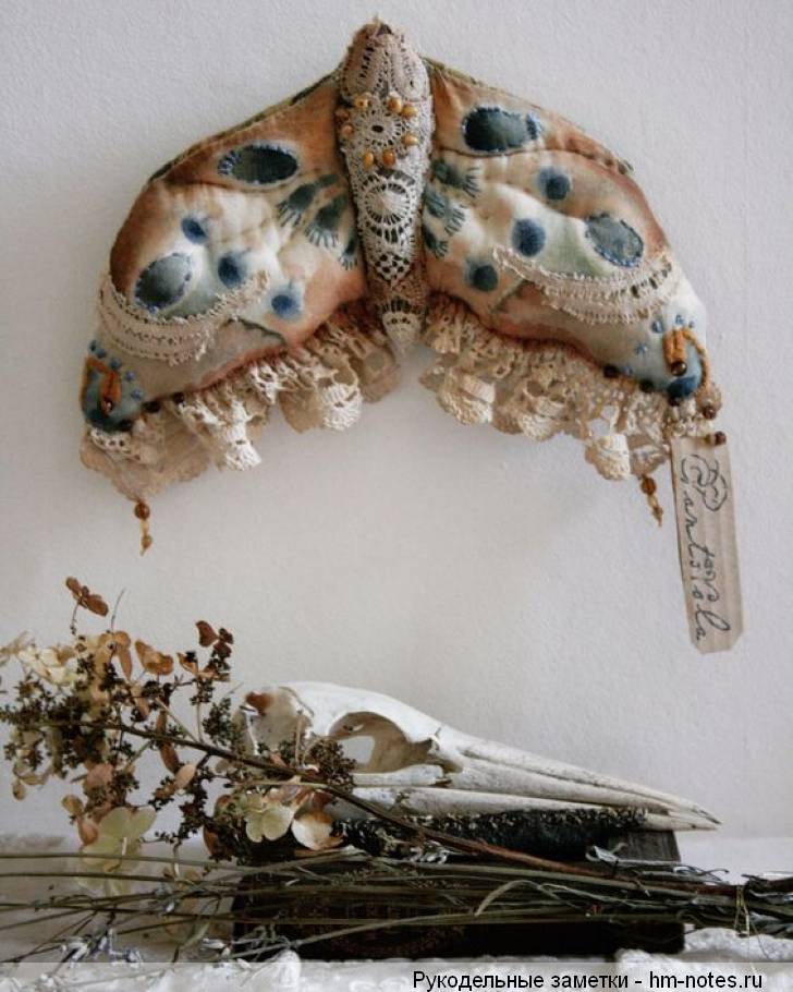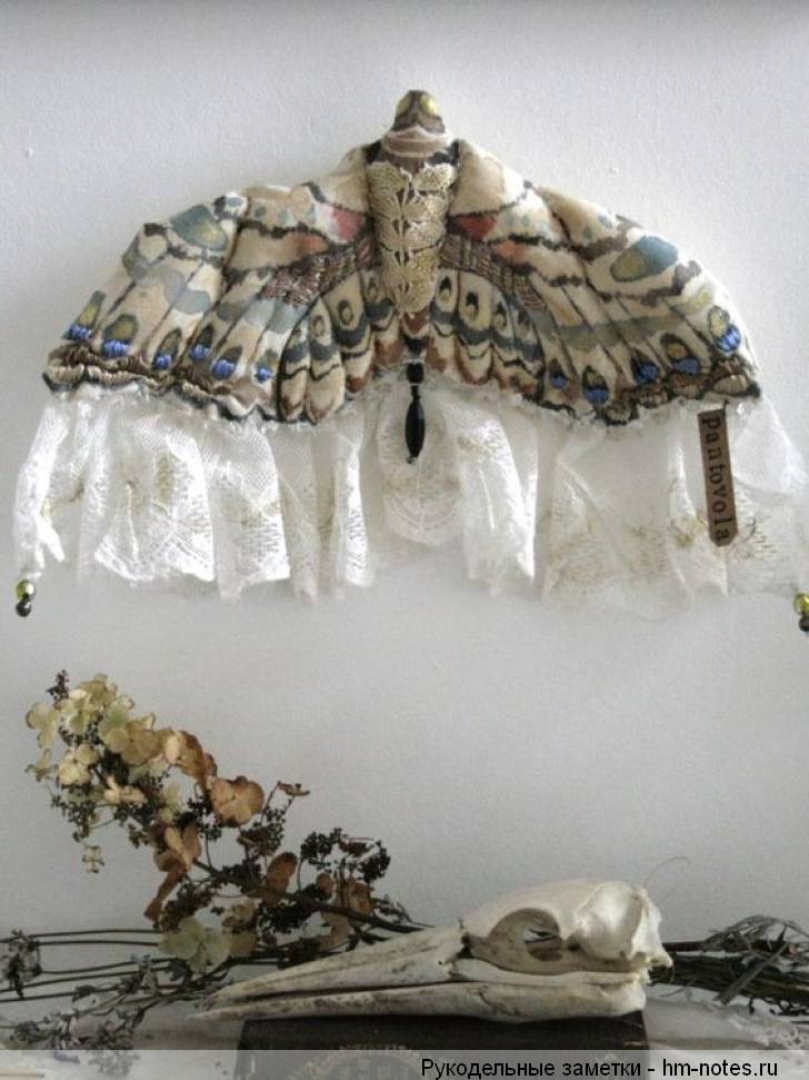 Здесь образ бабочки был использован в создании текстильного панно. В своей работе автор применила роспись по ткани, вышивку, кружево и крупные бусины.