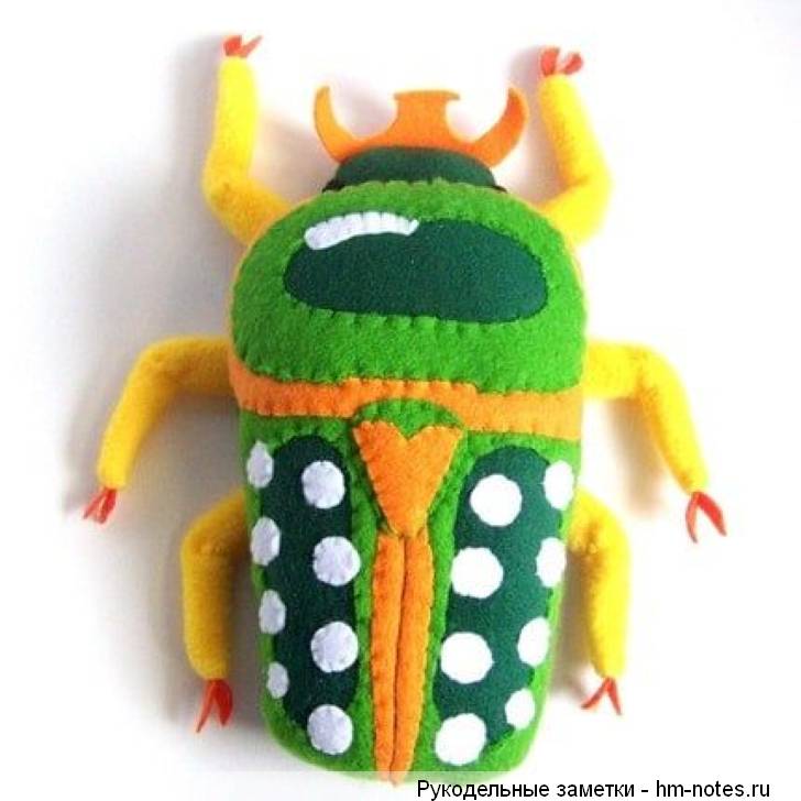Для старта возьмите этот простой шаблон и сделайте выкройку жука на ткани или фетре. Кстати, из фетра кроить даже проще, так как не нужно обрабатывать края, он имеет множество оттенков, хорошо держит форму и его можно не только сшивать, но и склеивать. Комбинируйте также различные материалы, украсьте поделку аппликацией.