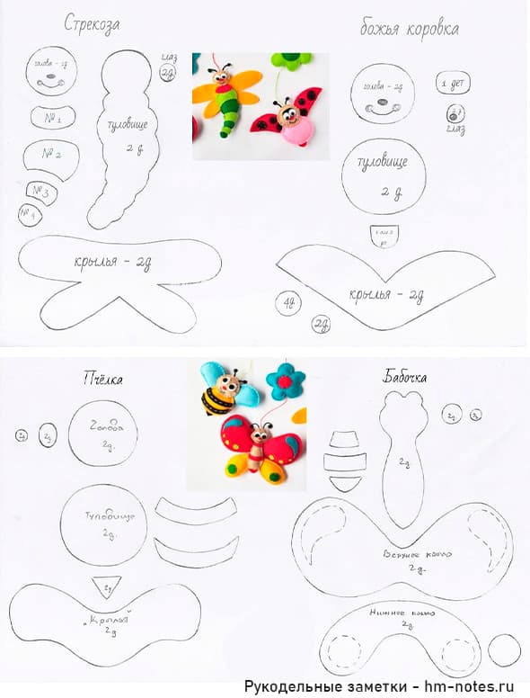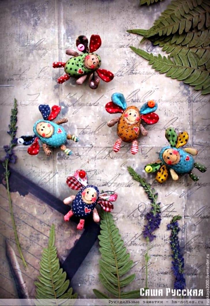 Невозможно пройти мимо текстильных букашек и мошек от Саши Русской. Далее вы найдёте три листа выкроек, чтобы попробовать сделать букашек на свой манер.