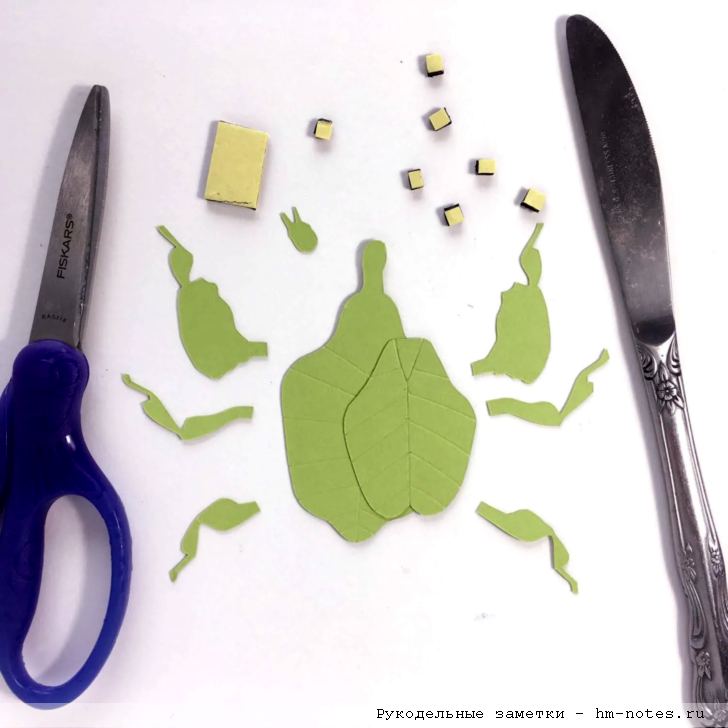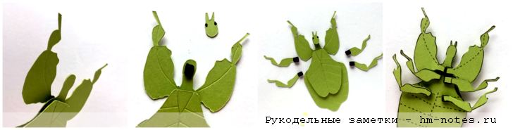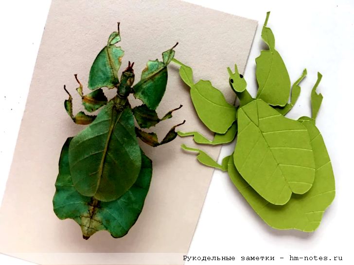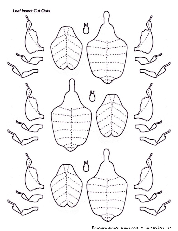 Любите вырезать, тогда сделайте из плотной бумаги, фетра или фоамирана вот такого богомола призрака, похожего на листик. Шить ничего не нужно, все детали просто склеиваются между собой.
