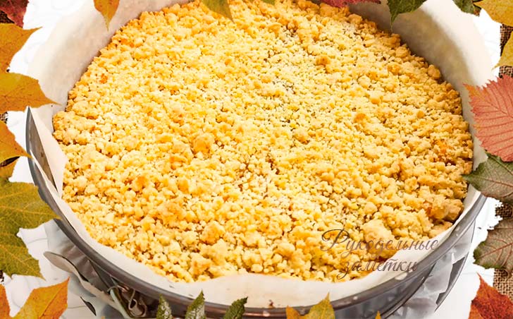 Возьмите круглую форму для выпечки 18-22 см и застелите её пергаментом. Достаньте из холодильника тесто и насыпьте на дно формы бо́льшую часть крошки. Слегка утрамбуйте тесто и положите на него равномерным слоем всю натёртую тыкву. Сверху посыпьте оставшейся крошкой и отправьте в духовку минут на 30-40 при температуре 170-180 градусов по Цельсию.