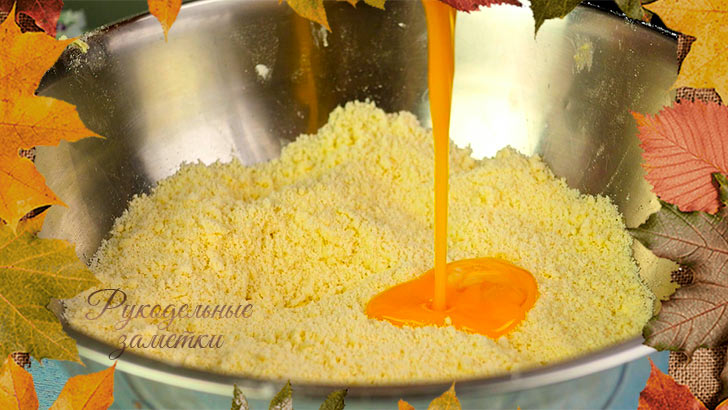 Отмерьте в глубокую чашку просеянную муку. Добавьте сахар, ванилин и соду. Всё перемешайте. Теперь в эту смесь натрите на мелкой тёрке замороженное масло, периодически обсыпая его мучной смесью, чтобы оно не слиплось. Теперь руками хорошенько перетрите все ингредиенты. Добавьте 2 желтка и лимонный сок и снова хорошенько перетрите тесто в рассыпчатую и не очень крупную крошку. Накройте тесто и отправьте в холодильник.