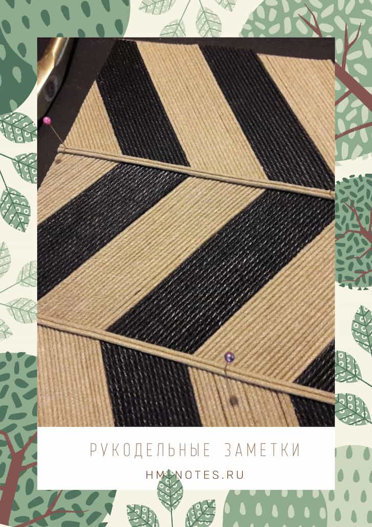 В этом примере используется прямое плетение из верёвки одного диаметра, но расстояние между рядами увеличено. Несмотря на это, изделие выглядит плотным и без зазоров благодаря толщине каната.