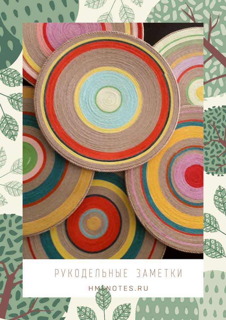 Ещё один способ создания вещей из каната или шпагата — смотать их по кругу и зафиксировать клеем или сшить нитками.
