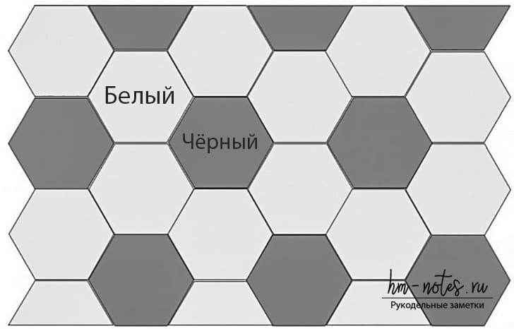 Связать крючком 12 белых и 6 чёрных шестиугольников, а также 3 белых и 3 чёрных трапеции. Сшейте детали между собой белой нитью по эскизу.