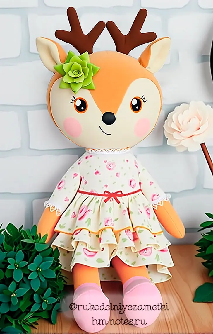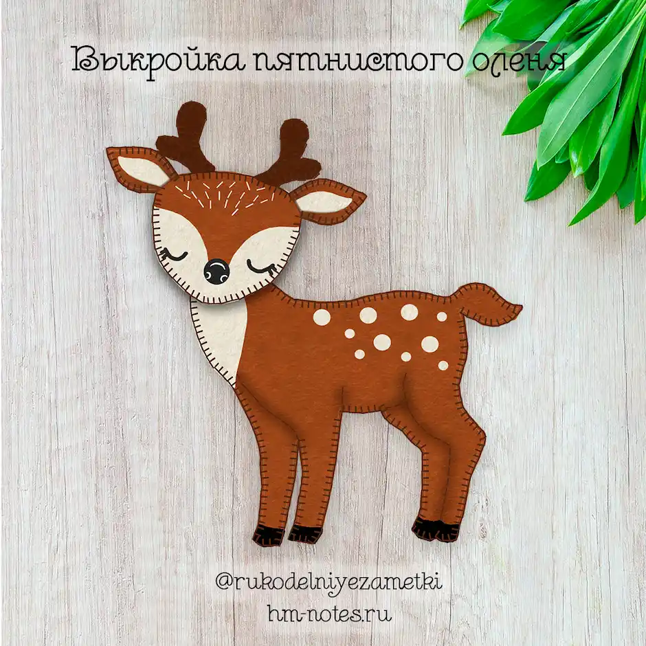 Дизайн игрушки напоминает оленёнка Бэмби, который немного подрос и у него уже появились молодые рожки. На его лбу вышивка, а на тельце белые пятна, которые можно вырезать из фетра или нарисовать акриловой краской. Блики на носике нужно нарисовать белой акриловой краской или маркером.