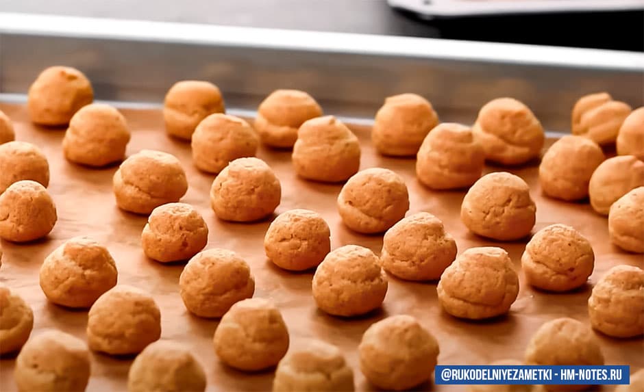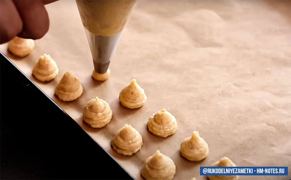 Готовое тесто переложите в кондитерский мешок с круглой насадкой диаметром 7-8 мм. Противень застелите бумагой для выпечки. Отсадите на него тесто диаметром и высотой до 1,5 см на таком же расстоянии друг от друга. Смочите палец водой и слегка примните шипы, образовавшиеся на верхушке после отсадки теста.